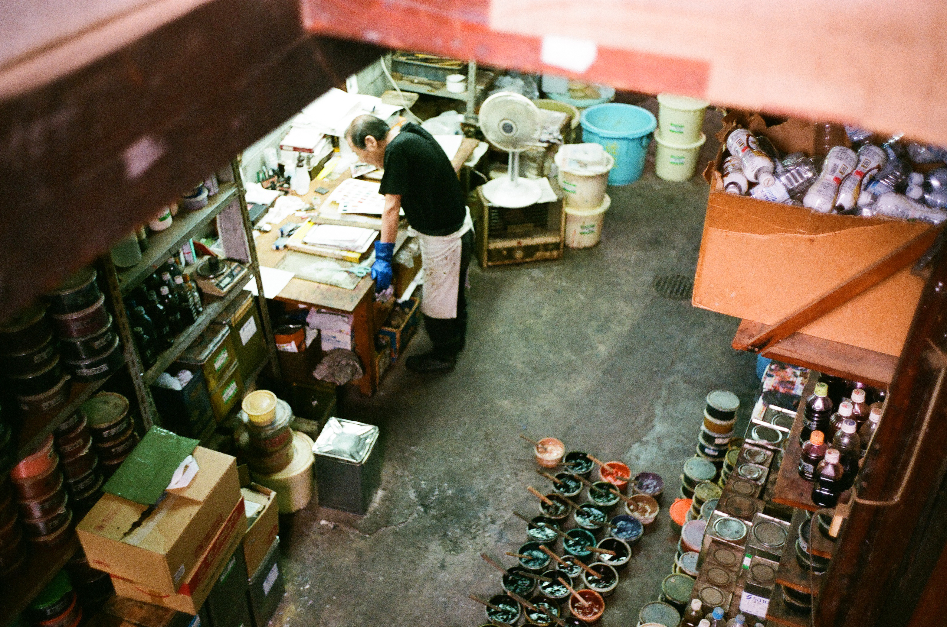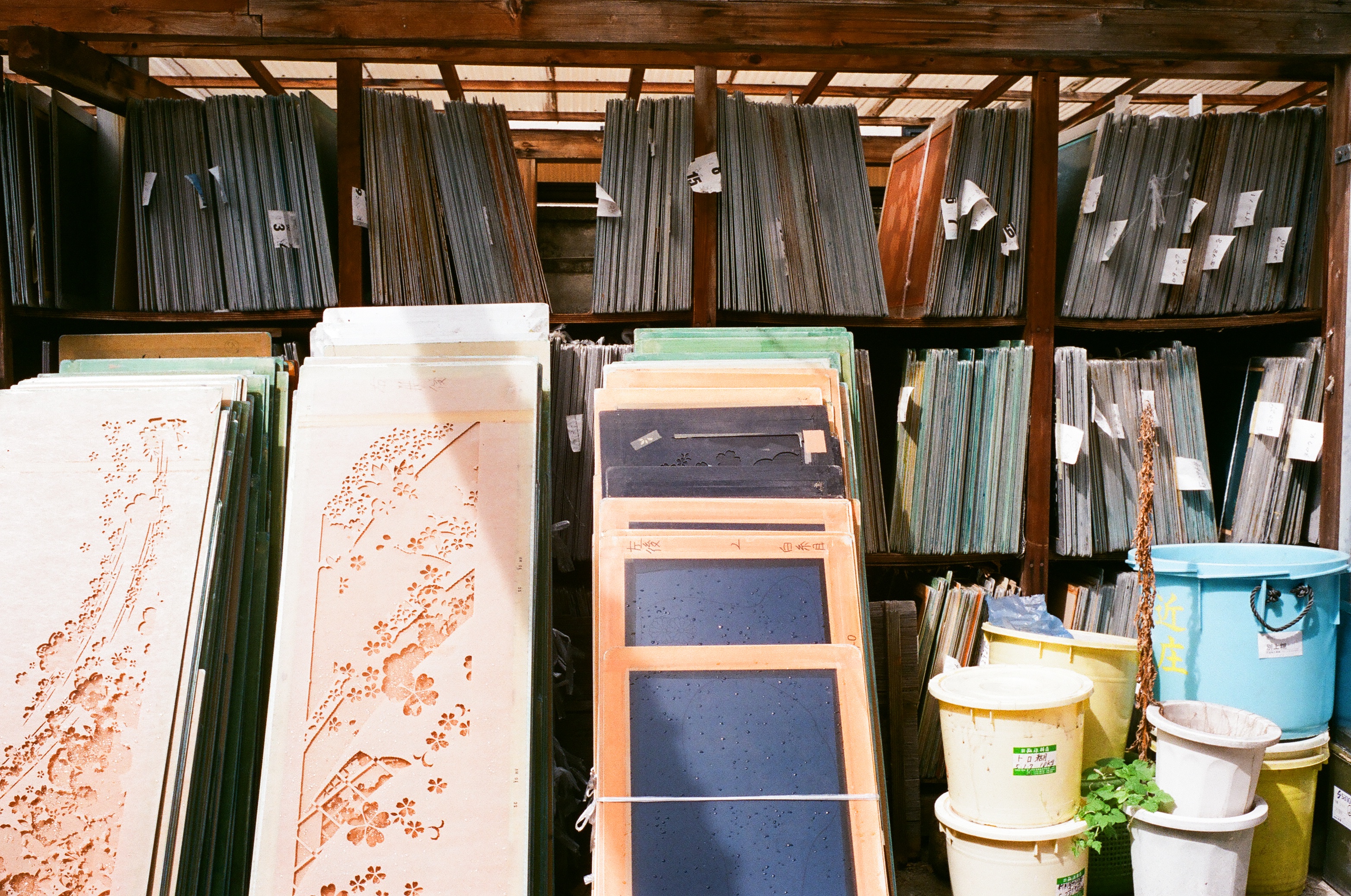 Among Kyo yuzen, Kata yuzen uses molds to enable mass production of the same dyed patterns. Each color has its own mold, and the pattern is created by layering the colors. We use a maximum 30 colors for one kimono. Kata yuzen was first produced around 130~140 years ago, but the production process has hardly change. Every dyehouse makes its own colors, and next to the board room, there is a place where colors are mixed, called a paint place. Although the colors may look the same, each dyehouse has its own unique colors. This is what makes each dyer unique.