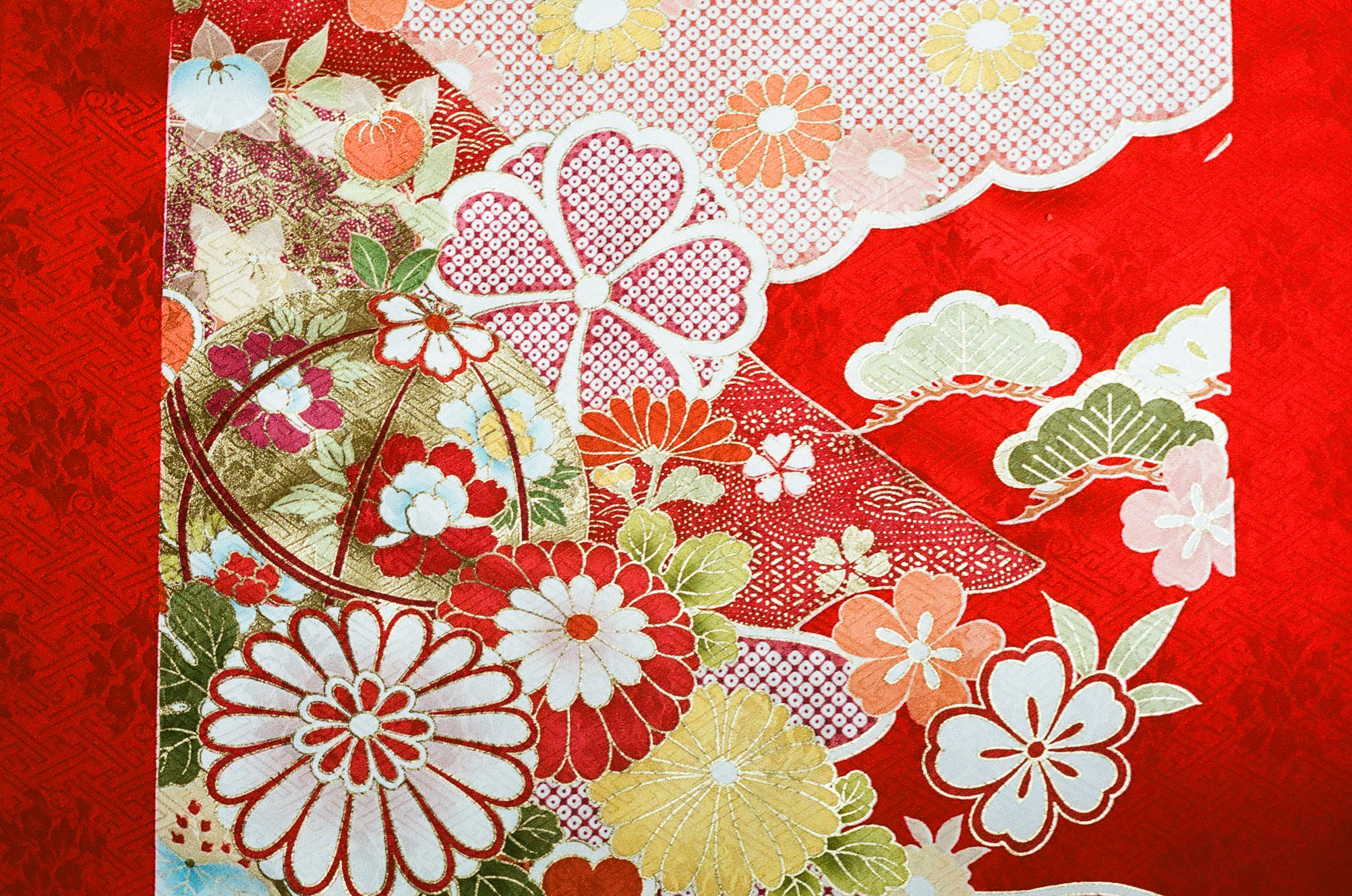 Furisode is the first formal kimono for unmarried women, and it is often patterned with lucky symbols, which does not have much of a seasonal sense. Cherry blossoms, autumn leaves, and chrysanthemums are all drawn on one Furisode kimono. Various seasons coexist. In a previous order we received, we were asked to make a pattern for a Japanese instrument orchestra. So we combined many patterns of Japanese musical instruments, such as koto, flute, and taiko, to create the world of a Japanese orchestra. It’s fun and a great show of skill whenever a story or sense of the world can be expressed in a single Furisode.